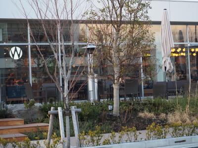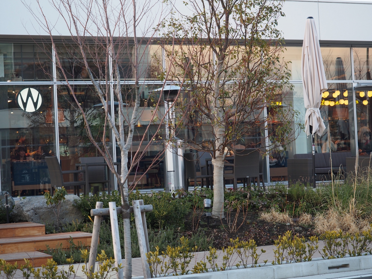 お店のまわりには植栽が植えられていて、まだちょっと弱弱しい感じですがそのうち気持ちのいい緑となってくれそう。気軽に使えてちょっとおしゃれなダイニングです。- 旅行時期