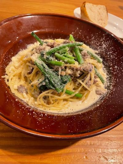大阪旅行中のランチでイタリアンが食べたくなって、検索して評価の高かったこちらへお邪魔しました。店内は縦に細長くて、手前の席はソファ席でカフェのような雰囲気でした。パスタランチをいただきました。ちょっと塩気が強かったけれどおいしかったです。