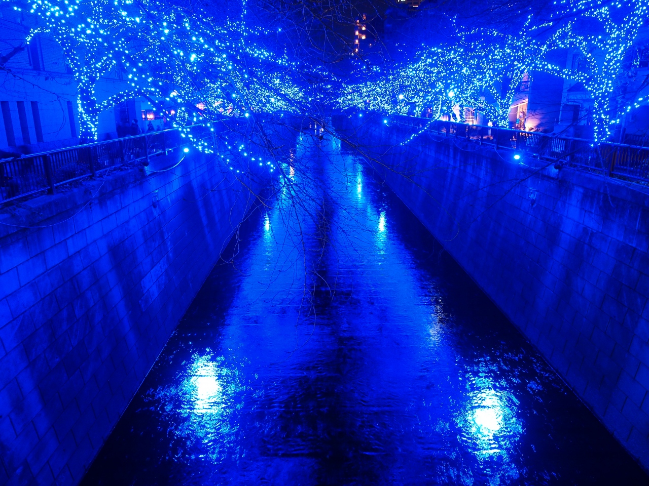 中目黒駅から徒歩すぐ。目黒川沿いの桜並木が青色LEDで彩られています。