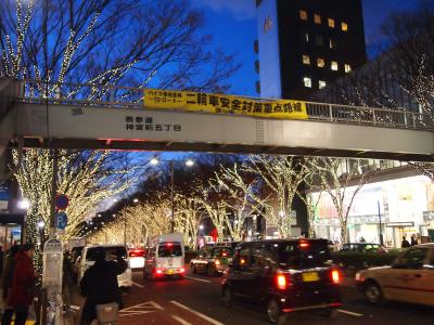 このライトアップ期間は歩道橋にはのぼれないようになっており、また、あちこちに警備の人がいてけっこう神経質になっています。(写真を撮っていたら注意されました)