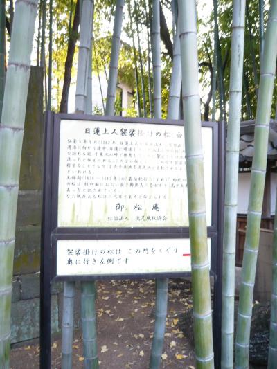 日蓮上人が身延山から湯治に向かう途中、池上本門寺を訪れる前に、池のほとりで休息した時に傍らにあった松に袈裟をかけて池の水で足を洗ったという言い伝えから残っている松だそうです。