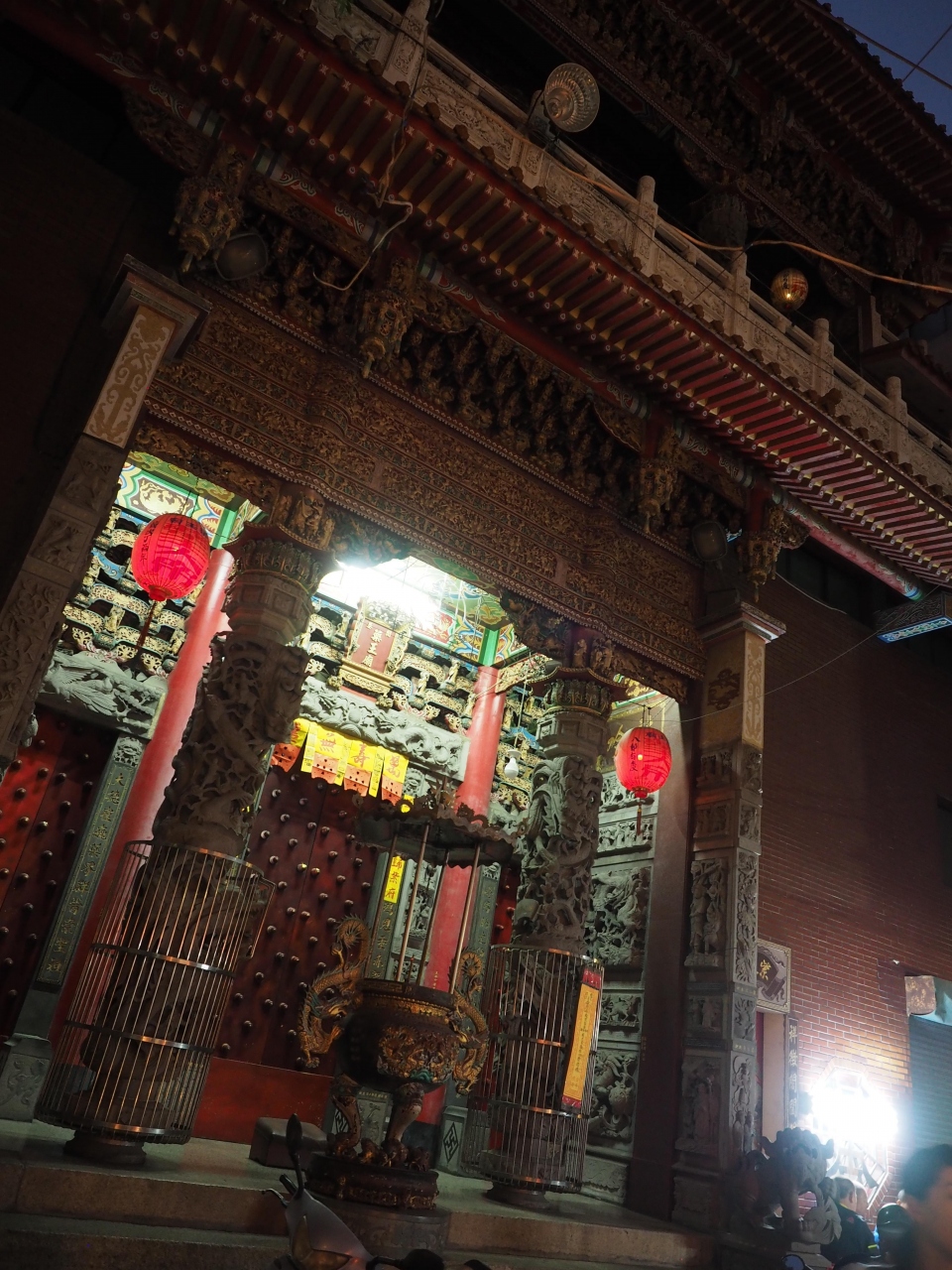 夕食後にぶらぶら台南市内を散策している途中で、路地の向こうにやけにキラキラしているお寺がある、と思って行ってみたら天壇でした。夜なのに参拝客もいて、熱心に何かお祈りをされていました。煌々とライトアップされていてとてもきらびやかで、地元で大切にされているのがよくわかります。