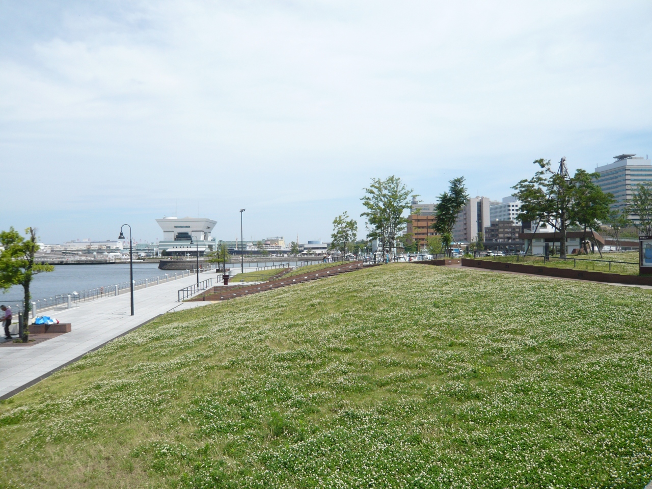 綺麗に整備されていて、海側には大さん橋が突き出しているのが見え、反対側には横浜の古くからあるノスタルジックな建築物の屋根を望むことができます。