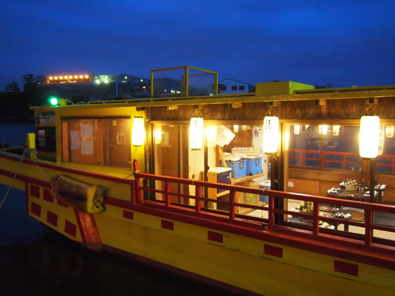 新木場駅から送迎バスに乗り5分、料金を払って案内を待ち、乗船所から屋形船に乗ります。