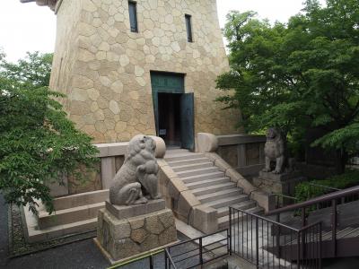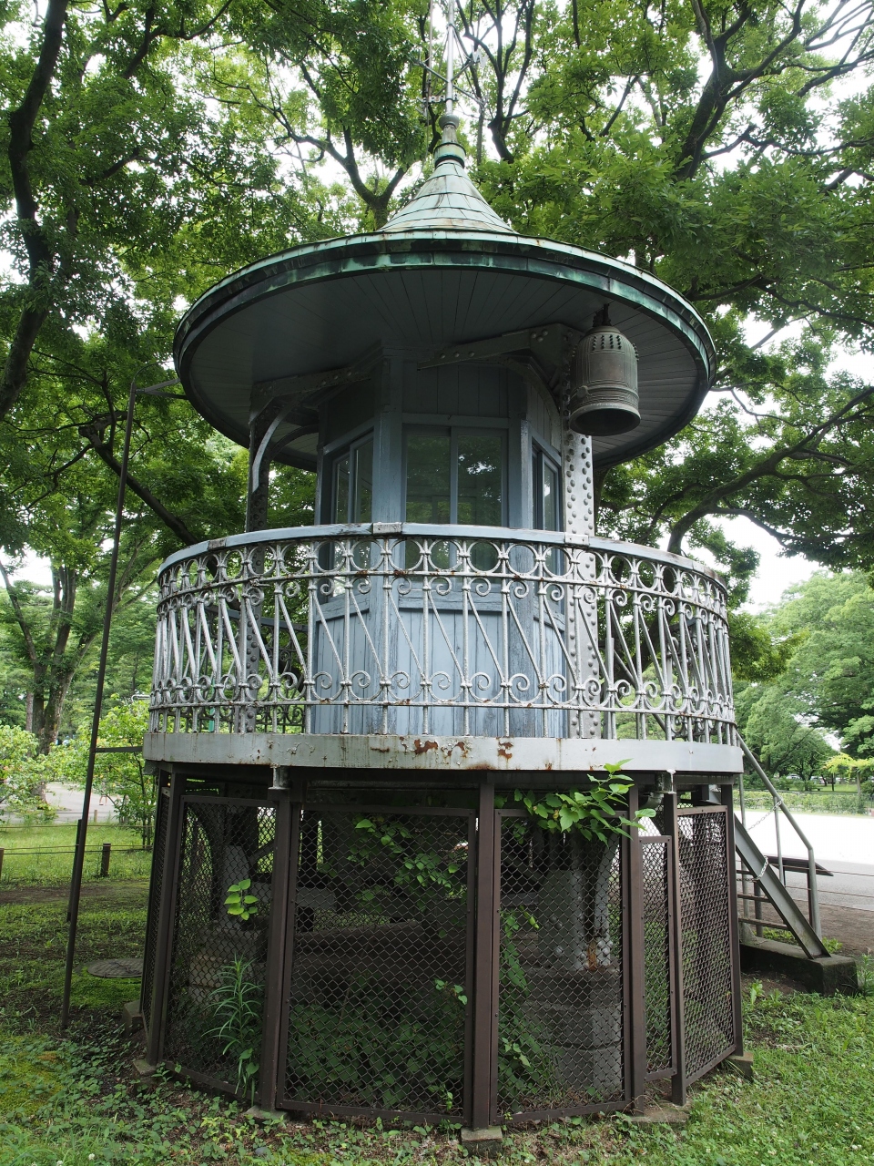 江戸東京たてもの園内に移築保存されている建物のうちのひとつです。もともとは望楼だったのでもっと高い建物だったようですが、今は上部だけ保存されていて高さはありません。安全のためか上にはのぼれないようになっていました。とんがり屋根が可愛くて、これが高い場所にあったらさぞ目立ったろうと思います。