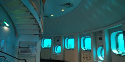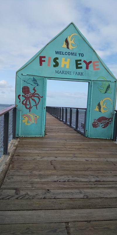 海中展望搭までは桟橋を渡って行きますが、この道、かなり風がつよいので帽子をしっかり被りましょう。展望搭内の螺旋階段をおりますとたくさんの魚が泳ぐ様子が見られます。規模は小さいですが子どもは喜ぶ場所でしょう。