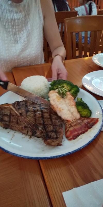日本語メニュー、日本語を話すスタッフがいて気楽に食事を楽しめます。すべて量が多いので足りないかな?位に注文しないと大変です。おすすめはTボーンステーキ。シーフードもおいしかった。7時過ぎると混みますから予約した方がいい。