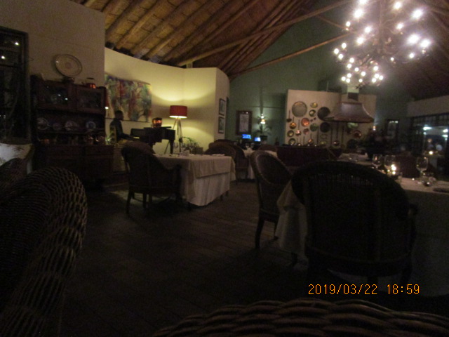 レストランでディナーを楽しみました。ザンベジ川の川魚のソテーでしたがスズキに似た感じの触感でおいしかったです。レストラン自体の雰囲気はヨーロッパ風な内装で、今アフリカにいるのだという感じが全くしません。照明が少しくらいですが、ピアノの生演奏もあったりして心地よい空間です