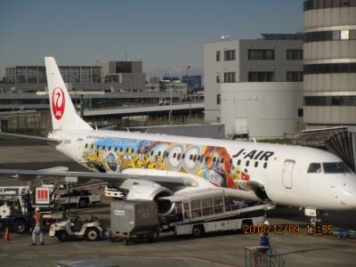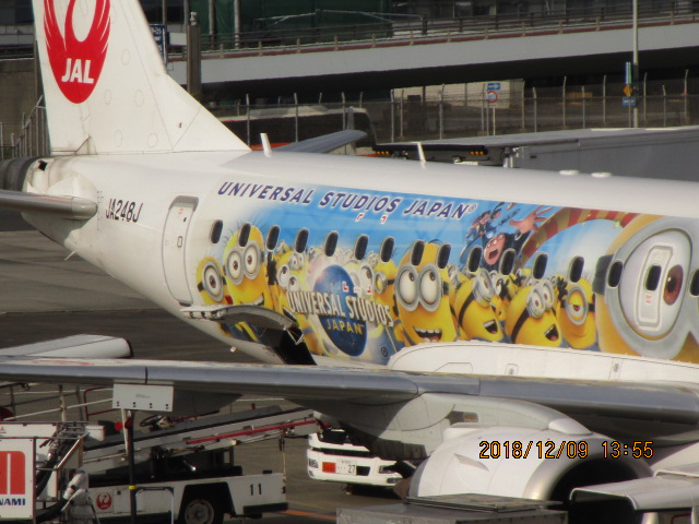 羽田空港ではたくさんの航空会社が乗り入れていますが、その中で折々に飛ぶキャラクターの絵入りの飛行機は待ち時間を楽しませてくれます。今回はミニオンズのJAL便。乗飛行機の中ではヘッドのカバーがミニオンズになっていました。いいですね^^