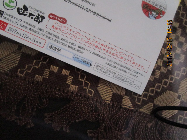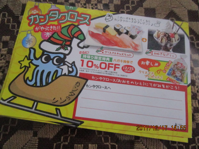 今はクリスマスバージョン。このはがきを持っていくと子供向けのお寿司+お好きなパフェが無料でふるまわれます(赤身・エビ・卵・納豆巻き・サーモン)