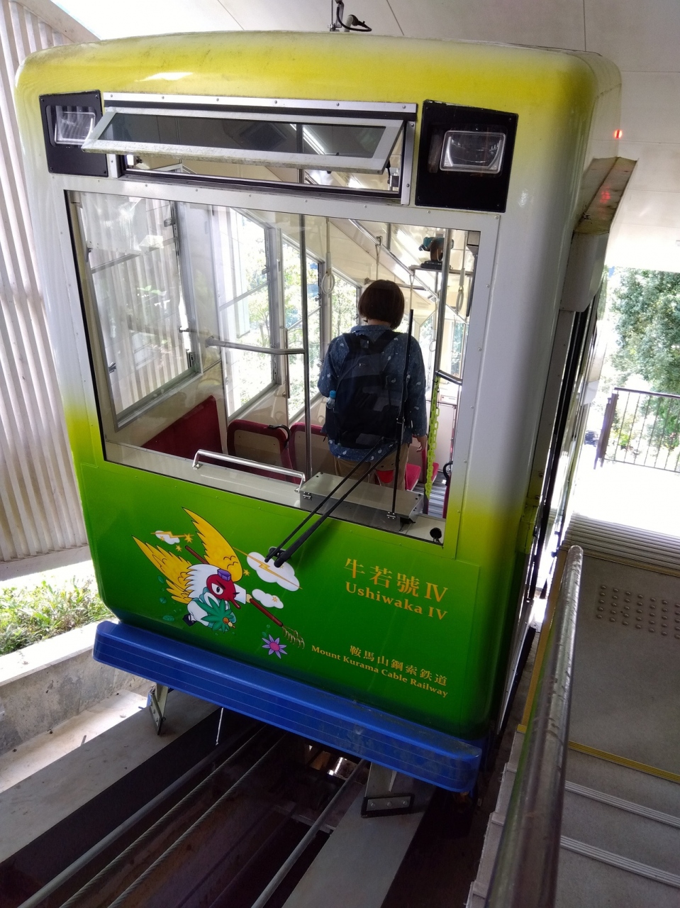 ケーブルカーは小さいので何人も乗車できませんが、つづら折りの山道を歩くよりは並んでも乗った方か良いです。乗車時間は2分位であっという間に到着。料金は200円。牛若丸の絵柄がかわいいです。鞍馬山と言うだけあってこの先は山道と階段の連続ですから是非利用をおすすめします