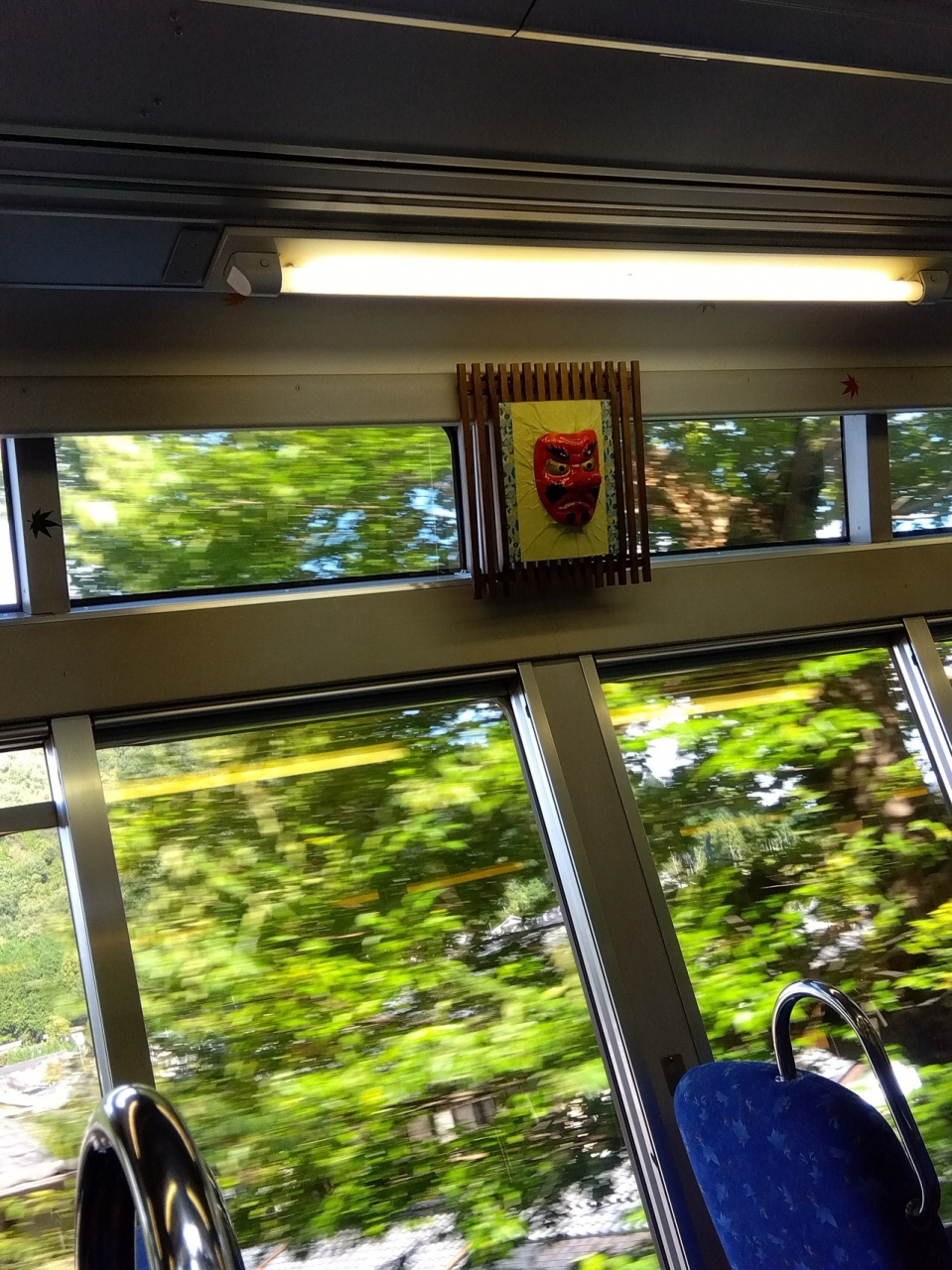 出町柳から叡山電鉄て鞍馬駅へ向かいますか眺望電車のきららを選択すれば車窓に向かって座れる座席か中央付近にあるので景色を眺め秋にはもみじのトンネルをぬって鞍馬へ行きましょう。電車の中は鞍馬天狗のお面が飾ってあり気分か上がります。