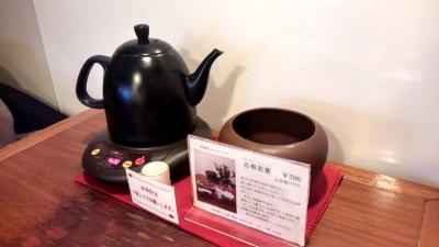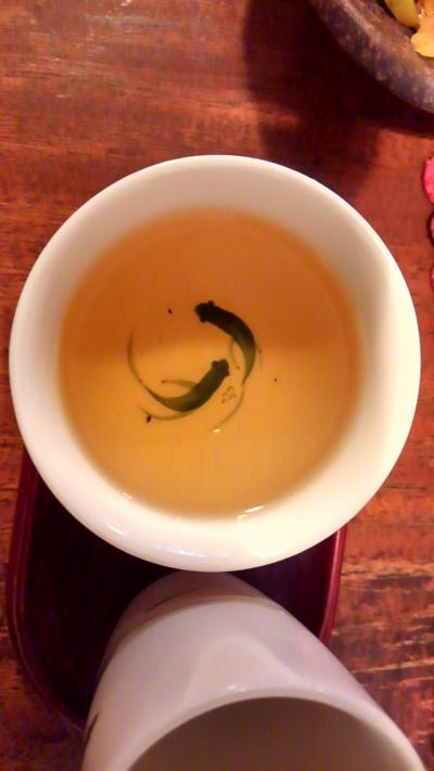 お茶の中で金魚が2匹泳いでいます。5杯くらい飲める上に、お茶請け付きで...