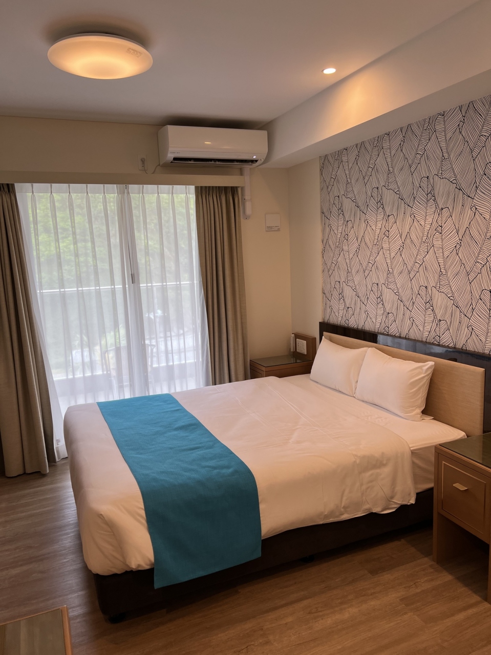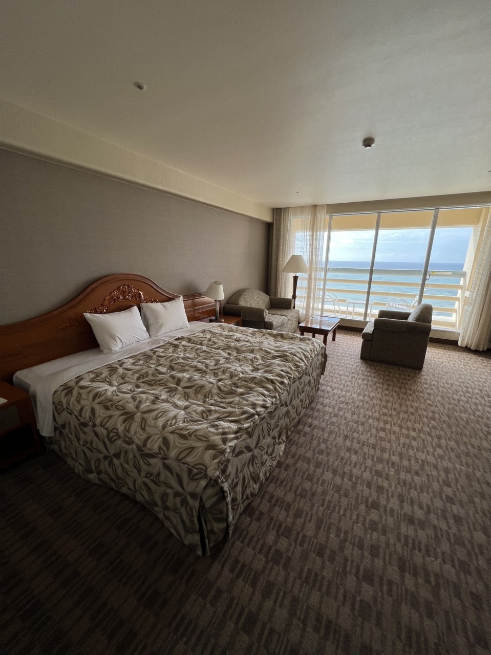 シングル利用ですがダブルベッドのデラックスオーシャンビュールームを用意していただきました。水回りなどに多少古さは感じましたが、コストパフォーマンスとしては最高でした。浴場はもう少し長く利用できればよかったと思います。