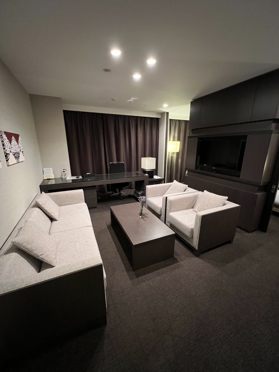 スイートルームのリビング側にデスクがあり、会議室の体をなしています。