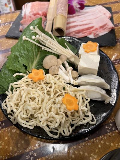 あぐー豚肩ロース、バラ、もも、やんばる若鶏つくね、島豆腐、エノキ、葉野菜、あぐー豚餃子、〆の沖縄そば、と一通り揃っています。