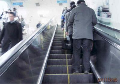 上海の地下鉄でエスカレーターに乗る場合には右側が立ち、左側は歩く事になっています。これは日本の関東地区は左側に立ち右側が歩きます。逆になりますので気をつけてください。(関西と同じ)まだ知らない人が多く守られてはいません。