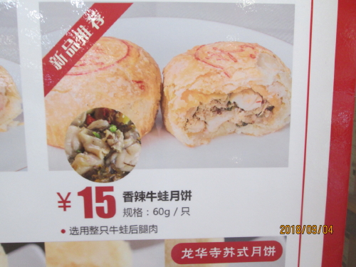 今年の新製品は牛蛙(食用ガエル)月餅です。上海名物と言えば上海蟹、次に龍蝦(ザリガニ)、現在一番は牛蛙(食用ガエル)です。牛蛙鍋から始まり牛蛙麺、牛蛙飯、と何でも牛蛙、食べるのに行列が出来ています。人気の牛蛙が月餅に成りました。南京東路にあ