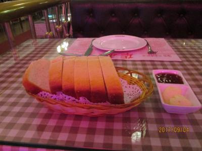 ロシア料理は何と言ってもボルシチでしょう。代表的なロシア料理のスープです。ロシア料理店なのでボルシチと言ったら通じません。メニューは中国語しか書いてありません。湯の所に紅菜湯と言うのがありました。考えるに赤い野菜スープ、これがボルシチです。ここのメニューは文字だけで写真がありません、哈爾濱でロシア料理を食べるならロシア料理名を中国語で覚えて来て下さい。