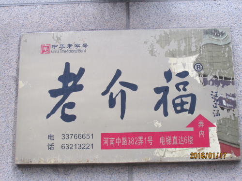 今回、第5回の上海優秀歴史建築に老介福が載っています。租界時代に建てられた南京東路X河南中路の角(南京東路257号)の建物7階建てを老介福大楼と言うようです。現在はFOREVER21(南京東路233号)と言う名のショッピングモールです。この建物の河南中路側の裏側に廻って見ると中華老字号の老舗に認定された老介福があります。河南中路382弄1号、エレベーターに乗って6階へと案内があります。建物裏の細い路地、エレベーターも古く乗るのに躊躇します。6階の一角に中華老字号(老舗)、老介福があります。豊富な生地を持つオーダーメイドの洋服店です。中国の住所は1つの建物で4つの
