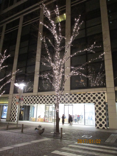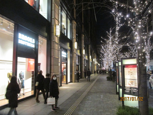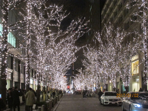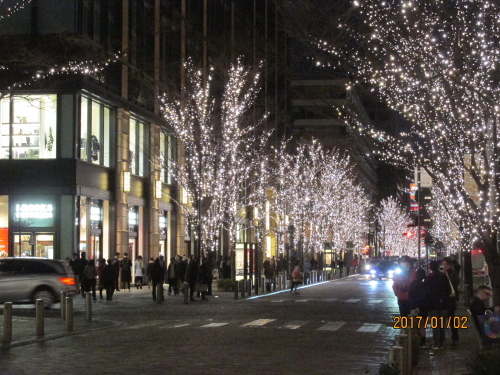 最近はクリスマスだけで無くお正月もイルミネイションを点燈するようになりました。東京駅前の丸の内仲通りイルミネイションを見に来ました。ブランドショップが通りを彩る約1.2kmにおよぶ丸の内仲通りや、大手町仲通りの街路樹、合わせて約250本が、上品に輝く丸の内オリジナルカラー「シャンパンゴールド」のLED約103万球で彩られ、ウインターシーズンの華やかな街並みを演出しています。両側のビルの1階に入るブランドショップも正月営業をして丸の内仲通りイルミネイションを盛り上げています。今年の正月は風も無く、気温も高く穏やかな正月です。夜も暖かくて快適なイルミネイション散歩でした。