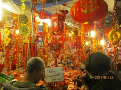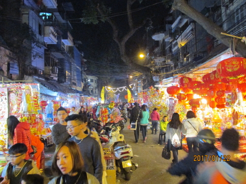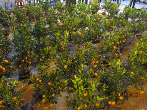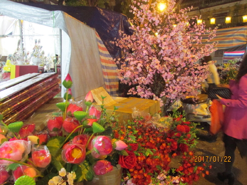 金柑の木と桃の花を売っています。大きさによって違いますが金柑の木は500万ドン(2万5千円)します。若者の給料が3万円ですから結構高い。縁起物だから値切ったり出来ません。皆さんバイクの後ろに積んで運んでいます。路の両側には正月の飾り物、金や赤い物が並んで居ます。中国の旧正月と同じです。ハノイの人々の旧正月は地方の人は故郷に帰り家族と一緒に美味しい物を食べて過ごすのだそうです。日本の様に海外旅行には行かないそうです。