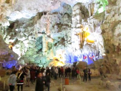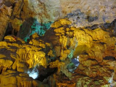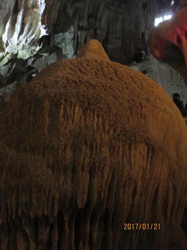 洞窟内の気温は夏冬一定で過ごし易いそうです。洞窟内は照明が点いて明るく、床は舗装されていて歩き易く出来ています。ユニークな名前がついた鍾乳石や石筍があります。中でもティエンクン洞窟のシンボルはおっぱい岩です。触ると御利益があるらしく、触った岩が黒光りしています。残念ながら二つ無くてはいけないおっぱいが一つしかありません。もう一つ出来るには何千年掛かるか解りません。