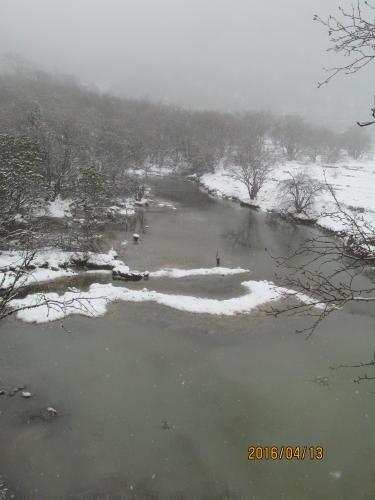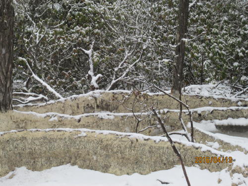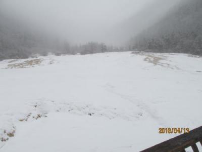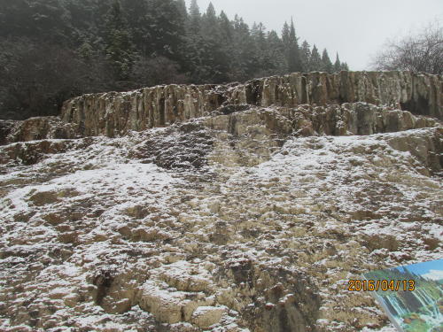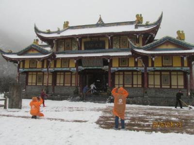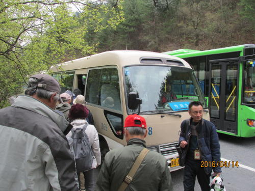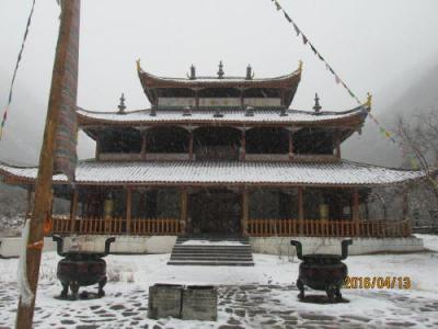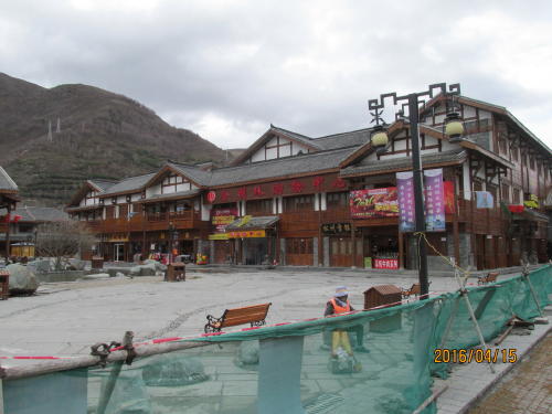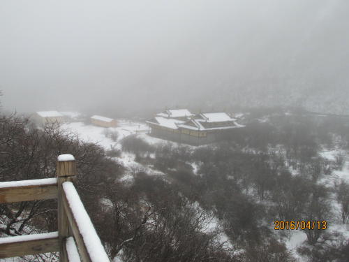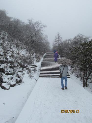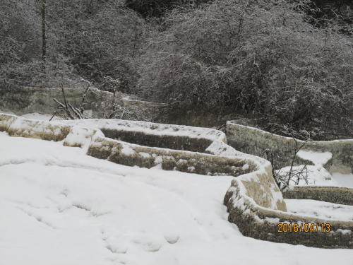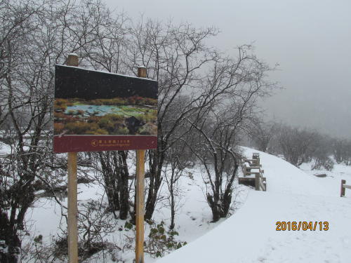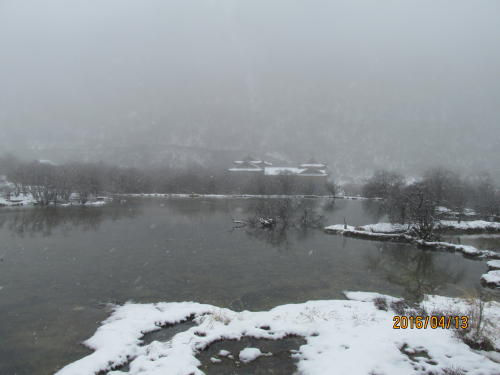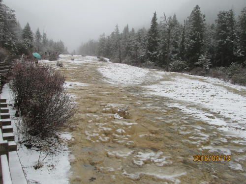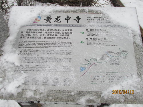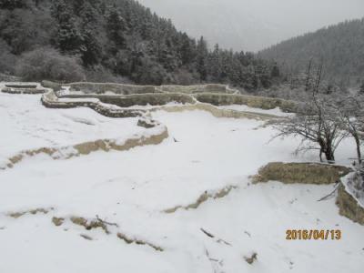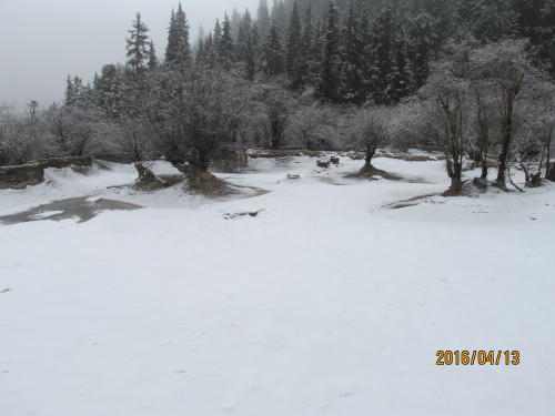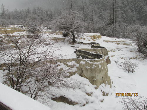 いますが一様目標16:30分華龍山荘に戻る事に成っています。現在14:40です。厳しい時間ですが多少は遅れても良いとの事でしたので折角ここまで来たのだから、下りだから時間短縮出来ると思い徒歩で下る路を選びました。これが大間違いで厳しい物と成りやっとの思いで華龍山荘に帰り着く事になりました。黄龍風景区は毎年1月ー5月渇水期です。水の景観は臨めないと、御理解いただき6月〜10月に豊水期にまた来て下さい。書いてあります。渇水期で景色は全滅、雪が降っていて足元が悪い、軽い高山病でめまいがするので最悪状態、何とか思い足を引きずって華龍山荘に予定時間を少しオーバーで戻りました、何人かは遅れて17:30頃となりました。それから九寨溝へ 130? 3時間のバスの旅です。帰りも4000mの峠越えでくねくね坂を通ります。疲れと高山病で気持ち悪く成ったり、戻したりと大変でした。黄龍に1泊したいが明日は九寨溝へ行かねばなりません。- 旅行時期