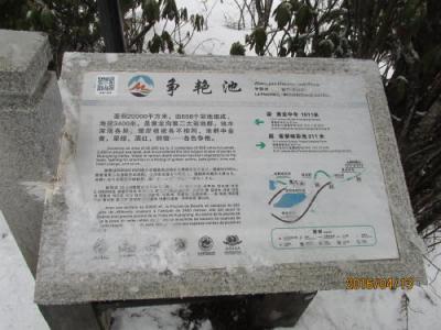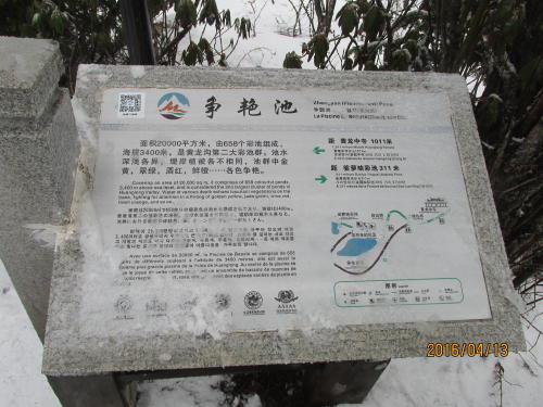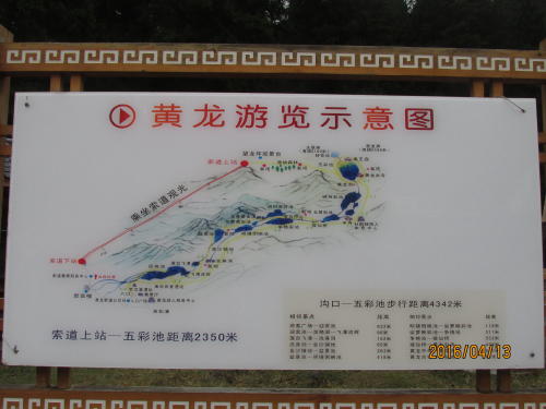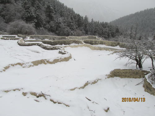 黄龍全体のうち、麓の「迎賓彩池」(標高3199m)から「五彩池」(標高3553m)までの約3.7kmの区間が風景区として整備されています。水の色は場所によって黄色、緑色、青色、茶色と様々に変化して見え、晴天時は日光と相まって金色に輝くと言われています。中でも風景区最奥部にあり黄龍最大の石灰華段である「五彩池」があります。「五彩池」を見ずして黄龍を語るなかれと言われています。残念ながら雪で白一色でした。