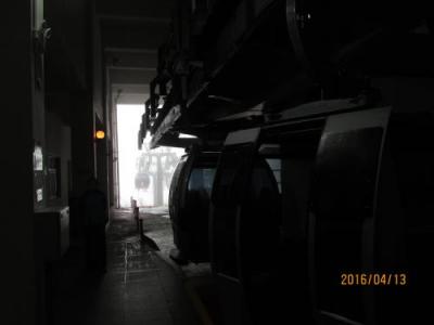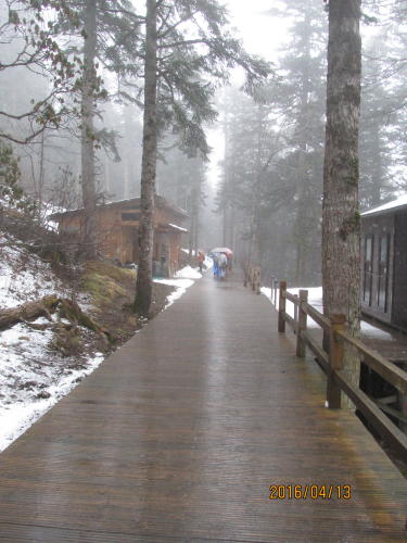 分岐点の路、ここからロープウェイ山上駅まで徒歩2.1?(50分)真っ直ぐ行けば入口ゲートまで3900m(110分)の下り道。但し晴れの日のタイムで雪が降り木道が滑り易く、高山病に掛かっていると多くの時間が掛ります。ツアーは自分のペースでと成って