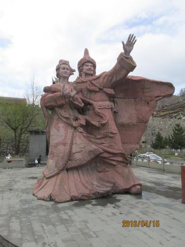 九寨溝から成都に戻る途中に有る四川省松藩県。九寨溝から90?バスで2時間、高速道路は有りません、途中峠越えの曲りくねった路を通ります。標高は九寨溝2000mから4000m近くまで登り、川主寺鎮標高3000mを通り松藩県2800mまで下って来ました。この先成都までは330?7時間を要します。成都の標高は500mです。松藩県の街の中に城壁に囲まれた松藩古城があります。ツアーはトイレ休憩に寄った程度で松藩古城内の観光はありません。三国志好きの私は松藩古城内を観光したかった。ここは唐の時代長安(今の西安)の漢民族唐朝と少数民族のチベット族とが戦争と成りましたがチベット王「ソンチェン・ガンポ」が強いので唐朝は皇女「文成公主」をチベット王の妻に差出し和睦を図ったのだそうです。当時西安から松藩まで来るのに2年間も掛かったようでチベット王は松藩まで迎えに来たのだそうです。城門の側に二人の像が立っています。当時は三蔵法師がインドから仏教の経典を持って帰り仏教が広まった時代、文成公主は嫁ぐにあたり多くの仏教の経典や文物をチベットにもたらし、現在のチベット仏教の礎を築いたそうです。松藩古城内には7万人の住民が生活をしています。テーマパークのような物で土産物屋や飲食店が軒を連ねているようです。