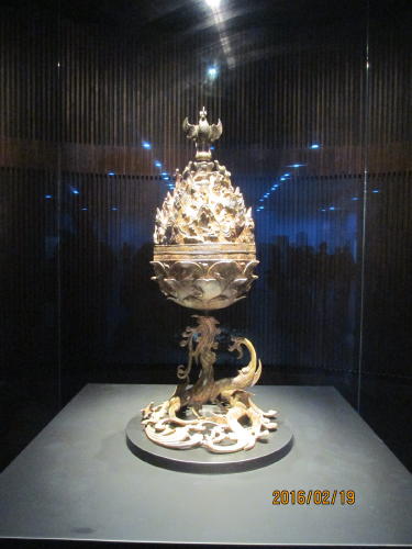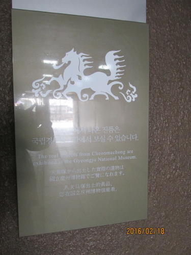 新羅時代の古墳群にやって来ました。ピラミッド違い盗掘に会わないそうです。それは構造の違いなのです。この古墳の造り方は積石槨墳と言い、棺室の上に丸い石を10m程積み上げて、その上に2m程土を盛るのだそうです。棺室への通路はありませんので入る事はできません。穴を掘っても丸い石は崩れて来て下敷きになって入れません。古墳全部の土と石を取り除かなければ棺室へ辿り着けないのです。盗掘に会わないので出土品は形を崩さず多くの遺品が収集できたのです。今回は出土品を全て写真に撮ってきました。天馬塚の名前の由来になった白樺の皮で作られた、天を翔る馬の図が描かれた障泥(泥除けのための馬具)も写真を撮って来ました。- 旅行時期