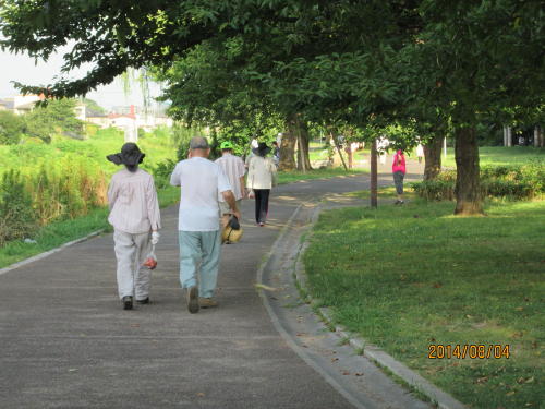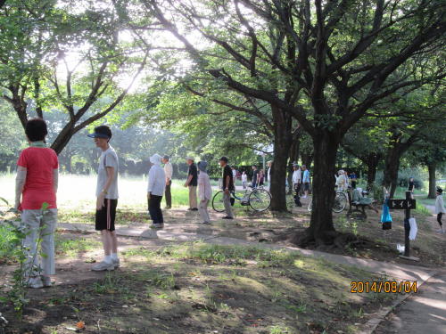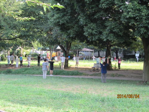 夏休みと言えばラジオ体操です。私達の時代は夏休み期間中は毎日ラジオ体操が有り、出席のスタンプを押して貰い、夏休みの終わりにノートを賞品に貰ったものです。現在の小学校は最初と最後の1週間だけしかやりません。ここ柏市高田近隣センターの広場では1年中、ラジオ体操が開かれています。近隣住民は大堀川の遊歩道をウオーキング(散歩・ジョギング)しながらラジオ体操に来るのを日課としています。皆さん健康には十分注意し、特にこの時期は熱中症に注意し元気にお過ごし下さい。