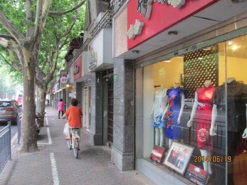 長楽路はプラタナス並木の続く路、准海路の北側を並行して東西を結びチャイナドレスの専門店もある。