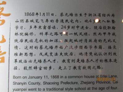蔡 元培は魯迅と同じ紹興の出身です。紹興にも蔡 元培故居があります。蔡 元培は清末民初の政治家であり、教育家でもありました。北京大学の学長を努め大学改革をおこなった。2度のヨーロッパ留学で革命の思想を体得し、民権と女性の権利を提唱しました。