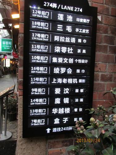 個人ショップの集まり、手作りのオリジナル商品が一杯です。女性の好きな小物が揃っています。日本人が出した店もあります。食事や喫茶も個人経営。手作りのオリジナル食品を食べたり、飲んだりと人と人の触れ合いを大切にしたお店ばかりです。最近は南京路や新天地より観光客に人気があります。最近は4本の通りを明確にして、通路を確保したり店舗案内板を作ったり、新しい店舗も多く出店しています。旧正月でも何時もと同じ賑やかさです。殆んどの店が営業しています。- 旅行時期