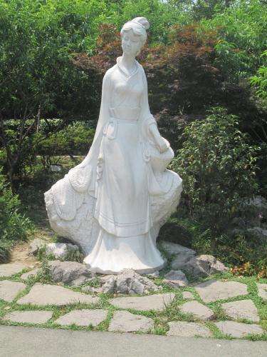 中国四大美人のひとり 西施ゆかりの公園です。中国古代の四大美人は、西施(春秋時代)・王昭君(漢)・貂蝉(後漢)・楊貴妃(唐)だそうです。西施の時代は細身が美人。楊貴妃の時代には太身が美人。ここは太湖の内湖です。春秋時代茫蠡と西施が隠居生活を送った場所です。西施が暮らした家が再現されていたり、庭園が整備されたりしてます。茫蠡の蠡を取って蠡湖と名付けられ、蠡の意味は蓮だそうです。蠡湖の真中にある小さな島に西施荘があります。西施荘へは遊覧船で渡る事が出来ます。