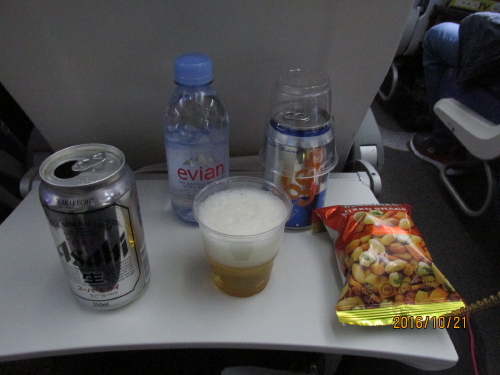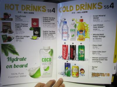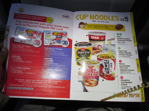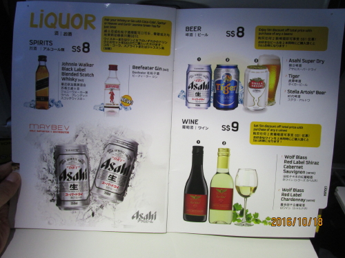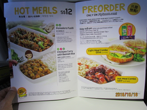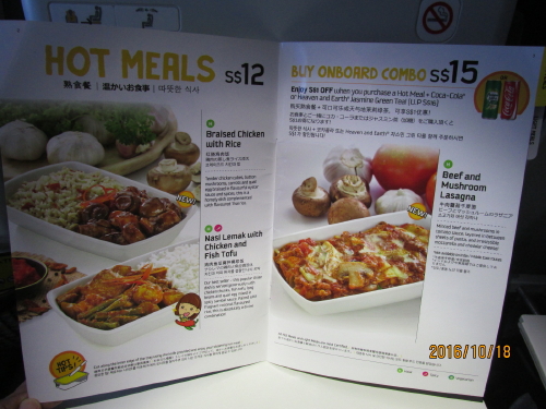 格安航空会社なので飲食物は有料です。メニューを見るとシンガポールドル表示で、余った台湾ドルで1000元出したがお釣りはシンガポールドルになるとの事、飲食物の値段も高いのに台湾ドル、シンガポールドルの直す度、レートが悪くなるので更に高い物に就きました。どうしても必要ならカードで払うか、出来るだけ利用しない方が良い、搭乗口前の自販機で買えば安い、飲食物持ち込み禁止ですが水ぐらいは目立たないように飲めば大丈夫でしょう。