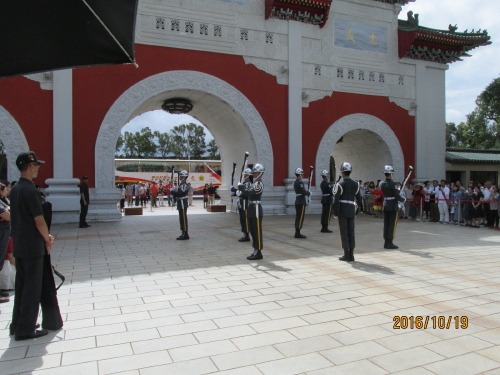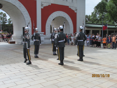 交替時の一糸乱れぬ行進、立哨中は微動だにいたしません。見ていても心地良いものです。選ばれた優秀な人でないとこの役は出来ないそうです。毎日何回も行進するので地面が歩く所だけ変色しています。現在は中国人観光客が減って静かに衛兵交替を見る事ができます。