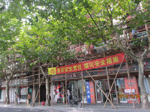 フランス租界の建国東路は上海の街を南北に結ぶ高架道路の重慶南路から肇周路まで、肇周路から先は建国新路となり西蔵南路へ出る東西の路です。建国東路は合肥路の一本南側の建物。重慶南路よりは新天地の南にあたり、再開発が進んでいて広い更地が広がっています。一部は高層ビルの建設が進み竣工間近に成っています。残り半分の路は1930年頃に建てた古い建物が残っています。プラタナス並木と商店街がつづく道が下町風情を醸し出しています。