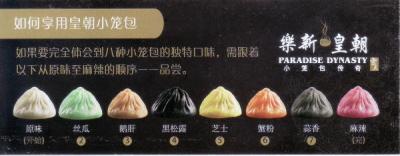 楽新皇朝 (上海環貿iapm店)は小龍包傳奇で有名なお店です。この店ならではの8種小龍包を味わって見ました。まず見た目もカラフルです、8種小龍包は味の薄い物から濃い物へと順に味わって食べましょう。正しい食べ方も教えてくれます。8種類とは(豚肉)、