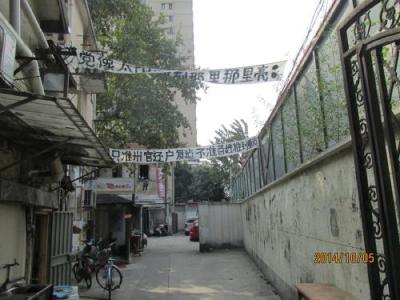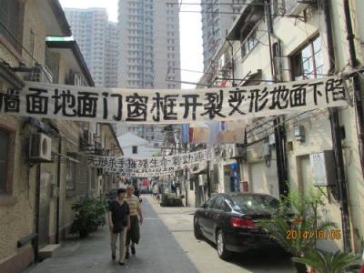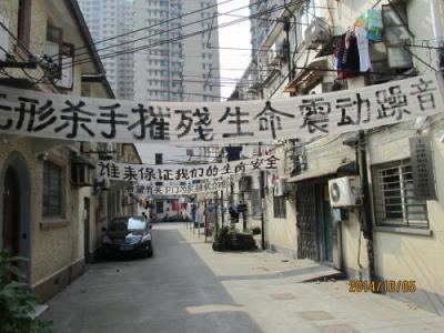 フランス租界の准海中路と陜西南路の交差点に建つ、13年8月5日にオープンしたショッピングセンター環貿iapm商場の超高層ビルは6年間に及ぶ工事期間を要しました。ここ環貿iapm商場の裏に当る陜西南路360弄は古い住宅で6年館の工事で階段がズレたとか、ドアが開かなくなったとか柱が傾き、生命の危険があるとか被害が出て、役所に何度も訴えているのに、取り合ってくれない。役所と大企業はグルになって民間人をいじめているとか。ここに実情を訴えるべく建物に横断幕を貼り廻ぐらしました。人通りの多い所で多くの人の目に付く所なので役所も重い腰を上げるのでしょうか?こんな住民運動を見るのは初めてです。