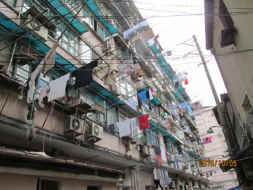 上海の下町・梅家街の路地は洗濯物が頭上に翻り、自転車置き場になり狭い路地がより狭くなる。