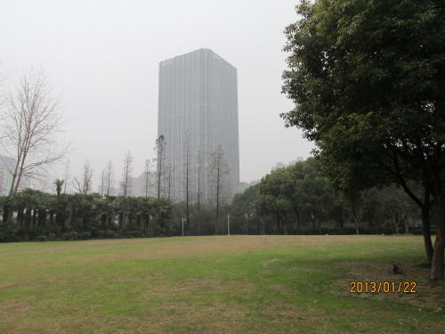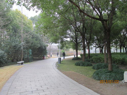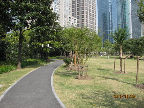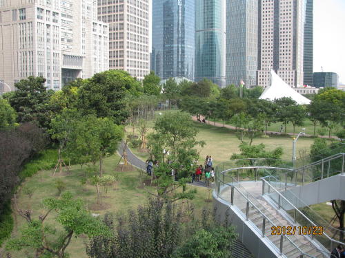 中央緑地は1997年7月オープン、面積10万?、「城市緑化」を目的。発展目覚ましい高層ビルが林立する陸家嘴の真ん中にあるオアシスが中央緑地。白玉蘭、銀杏、雪松など四季常緑で埋まり、浦東新区の形状の中心湖を配置し、湖には日本から来た錦鯉が泳いでいる。最高50mの噴水、池の畔の観景篷は白い海蝶のようです。観景篷には休憩、飲料、軽食、展望などが楽しめます。百年欅など樹木も豊富。芝生の中を曲がりくねった遊歩道にはベンチがあり、昼下がりには周りのビルから多くの人々が出て、食事や読書や休憩にと公園を利用しています。園内の一番南側には陸家嘴開発陳列館がある。