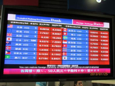 2013年1月21日、上海浦東空港到着、早速1万円を両替しようとしたら1万円は630元、手数料50元引くと580元との答え、耳を疑い確認するが間違えなし、昨年