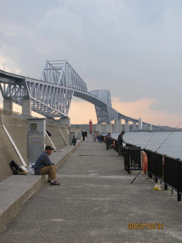 東京スカイツリーからゲートブリッジが見えましたのでそちらへ廻って見ました。押上から半蔵門線、大江戸線、有楽町線と乗り換え、新木場でバスに乗り換え若狭公園に着きました。近いが乗り換えが多く時間が掛る。ゲートブリッジにはエレベーターで橋上に出られます。遊歩道が付いていますので東京湾の景色を見ながら歩いて行けます。スカイツリー、東京タワー、天気が良ければ富士山や、遠くに海ボタルを見る事が出来ます。橋の下の堤防では海釣りを楽しむ人が大勢います。公園の売店で餌も売っています。尚この橋を渡って埋め立て地まで行っても何もありません。バスの便もありません。橋の中央で引き返すのが上策です。