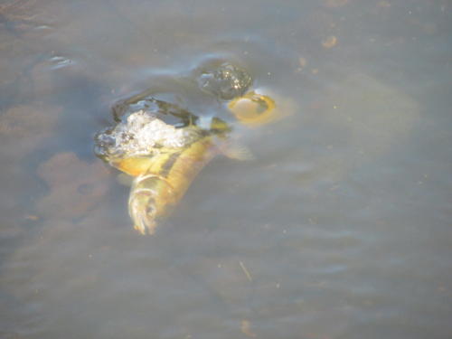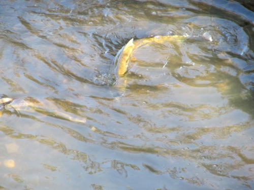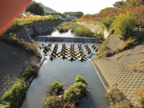 日本一汚い湖沼と言われた手賀沼を綺麗にする為、平成13年(2001年)に北千葉導水路が出来ました。利根川の水を手賀沼に流し込んで綺麗にする為です。平成16年に大堀川で鮭が発見されて以来毎年見る事が出来ました。鮭は 利根川から手賀沼を通り抜け柏市の大堀川まで遡上してこの堰堤の手前で産卵するのでしょう。綺麗になった大堀川には鯉が異常に繁殖していて鮭の卵を食べてしまうそうです。鮭の遡上の南限でもあるそうです。北海道の帯広で鮭の遡上を見ましたが物凄い数の鮭が泳いでました。数は全然少ないですが柏で見られるとは思っても見ませんでした。