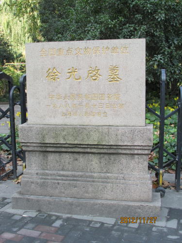 徐光启墓、南丹路17号(光启公園内)地下鉄徐家汒、一号出口を出て南丹路を西へ進む。9:00~17:00「全国重点文物保護単位」に認定されています。