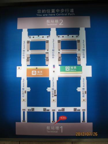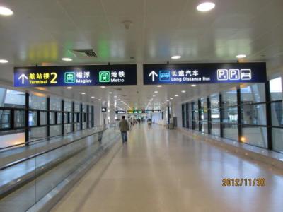 上海の浦東空港は大変解り安い配置に成っています。第一ターミナルと第二ターミナルに航空会社が分かれますので確認をして下さい。中国国内と国際線も航空会社別に分かれていますので一緒のターミナルです。第一と第二は向かい合っていて3本の太い通路で結ばれています。真ん中の通路の中間地点に空港ホテル、地下鉄、世界で唯一営業運転しているリニア(現在時速300km)、ファーストフード、高速鉄道、航空券のチケット売り場、等が集まっていて探す手間がいりません。虹橋空港に乗り継ぐには5時間程の乗り継ぎ時間を見なければならず不便です。将来リニアで両空港間を結ぶ話がありますが何時になるか不明です。虹橋航空は高速鉄道も入っていて国際線(アジア圏、羽田、金浦)、国内線主体の空港です。上海市内へは空港バス7路線、地下鉄、リニア、タクシー等が揃っています。話のタネにリニアに乗って見るのも良いでしょう。日々変化している浦東空港を紹介します。