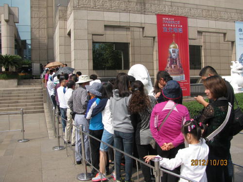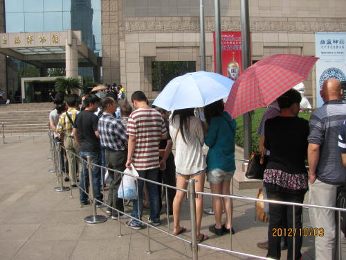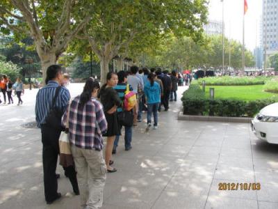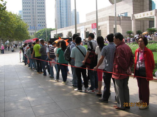 国慶節の上海博物館は長い行列。普段でも上海博物館は入場無料となっています。展示物をゆっくり見てもらう為入場制限をしています。展示物も多量の為、参観時間が長く、入れ替えに時間が掛ります。朝一番で並ぶ人も多く、開館一時間前には列が出来ています。